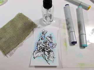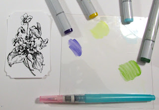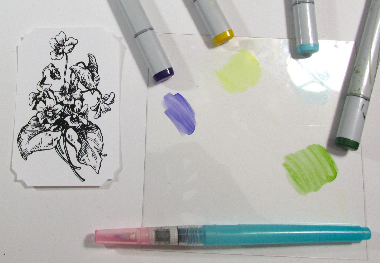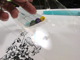 Color your chosen markers onto the acetate to create an artists palette. Now take the water brush filled with alcohol an touch the tip of the brush into the color needed.